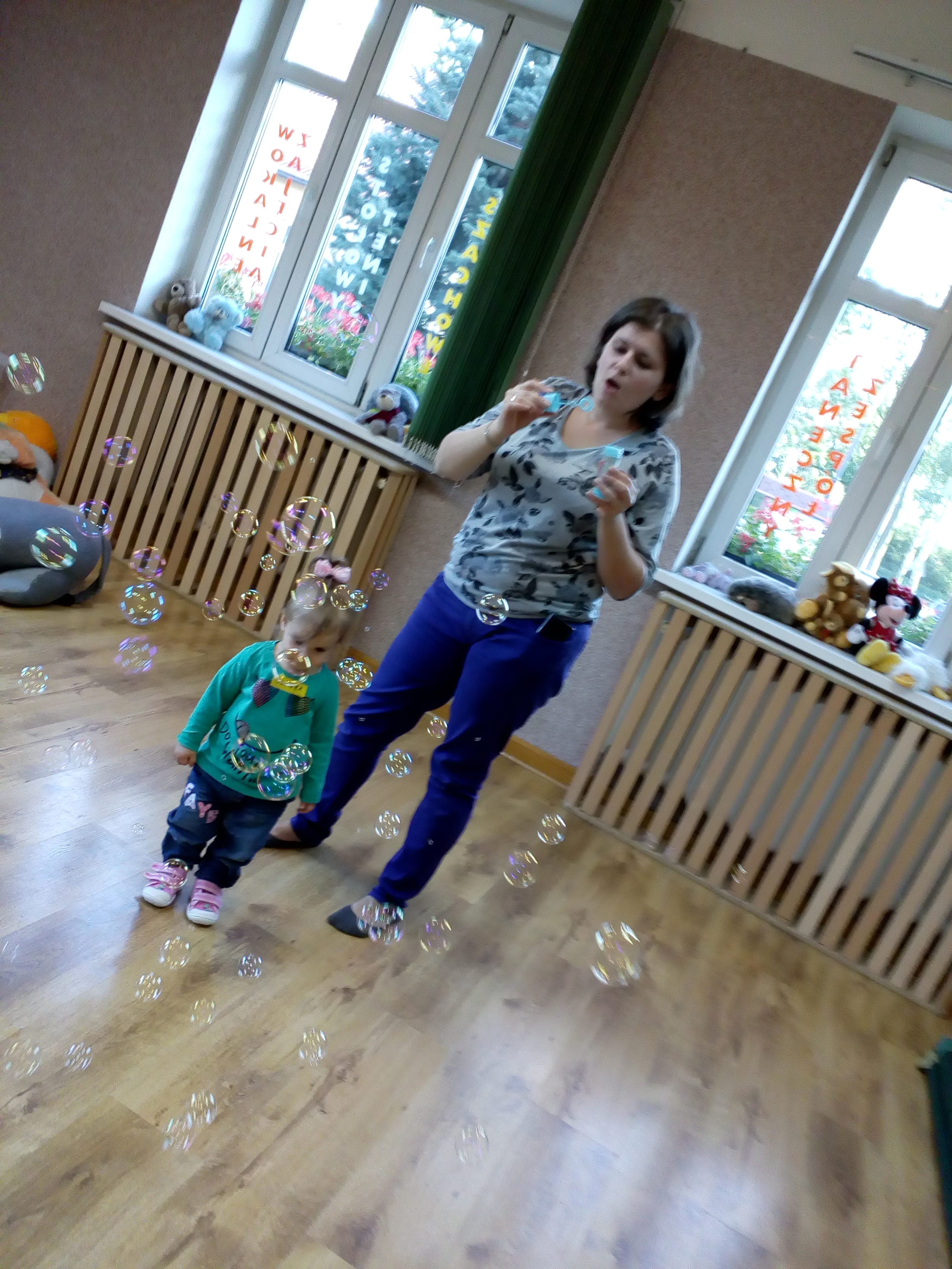 Wszystkie warsztaty obfitują w zabawy taneczne, ruchowe oraz śpiew. Tym razem ten katalog był wyjątkowo szeroki, głównie za sprawą dodatkowych atrakcji, a mianowicie – baniek mydlanych puszczanych przez mamy oraz kolorowych wstęg, którymi uczyliśmy się kręcić koła nad sobą i przed sobą, a nawet wokół własnej osi, którymi „rysowaliśmy” w powietrzu tęczę oraz sięgaliśmy od podłogi aż po niebo!