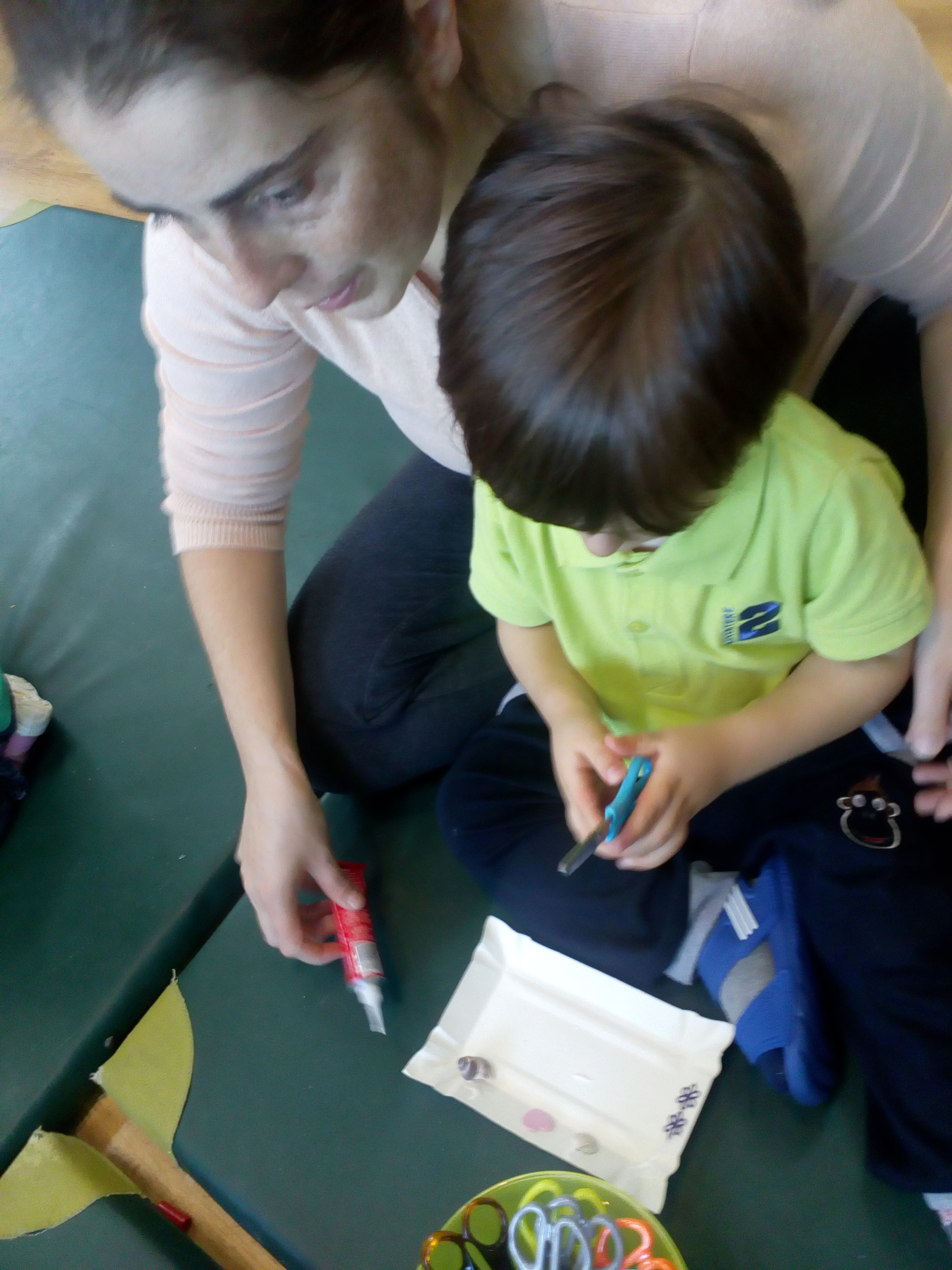 Po tej rozgrzewce mogliśmy zasiąść do prac plastycznych. Tym razem, zainspirowani złotą polską jesienią, postanowiliśmy zrobić kolorowe liście. Każde z dzieci otrzymało szablon liścia, który fragmentami z pomocą mamusi smarowało klejem, a następnie wysypywało kolorową… solą! 🙂